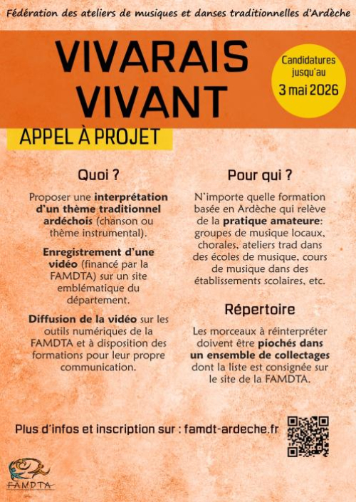 La FAMDTA (Fédération des Ateliers de Danses et Musiques Traditionnelles d'Ardèche) lance un appel à projets intitulé "Vivarais Vivant", à destination des musiciens amateurs du département (ou rattachés à une association membre de la Fédération). Ce projet s'adresse aux groupes, chorales, écoles de musique, cours de musique dans des établissements scolaires, etc.. Les participants sont invités à s'approprier un air du répertoire traditionnel du Vivarais et à en proposer une interprétation. Toutes ces interprétations pourront être proposées sur scène lors d'événements de la FAMDTA, et notamment lors d'une journée consacrée aux collectages à l'occasion de son Assemblé Générale annuelle de 2027.