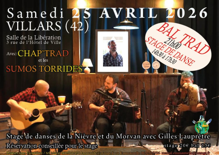Après la pause repas, CHAP'TRAD , groupe régional familial bien connu, ouvrira le bal à 21 h régalant les danseurs , puis ce sera le tour des " SUMOS TORRIDES" : Le son des cornemuses du centre de Jonas THIN, de l'accordéon de Quentin GALLEMARD et de la guitare de Romain MARCHAND nous emmènera d'Irlande en Pays de l'Est et bien sûr dans le Centre France .