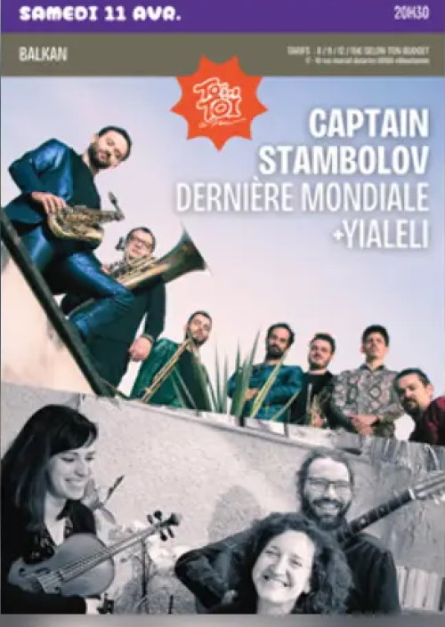 Profondément ancré dans l’héritage des musiques de l’Est, l’orchestre atypique expérimente sans relâche, mêle sonorités modernes et rythmes traditionnels, fusionne la chaleur des cuivres à celle des claviers électriques. Les sept musiciens de Captain Stambolov délivreront une dernière fois une énergie organique, puissante qui dessine avec précision les contours de leur esthétique Acid Balkan.