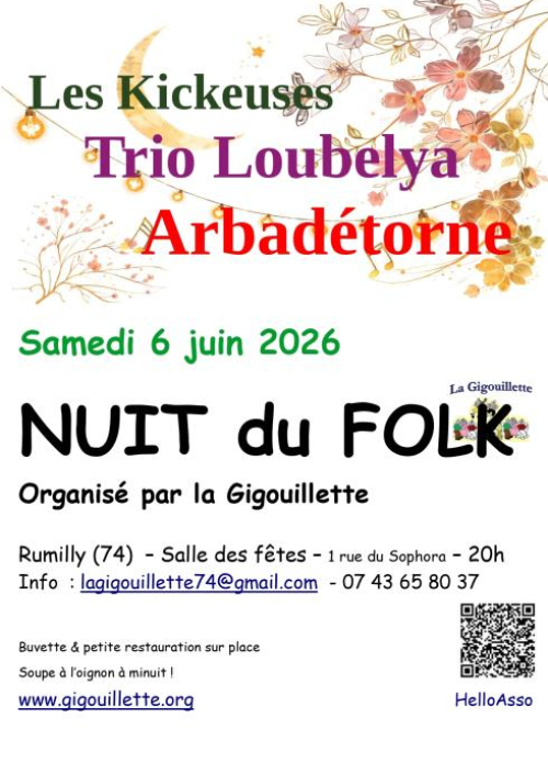 Nuit du Folk à Rumilly ( Salle des fêtes) avec les groupes - Arbadétorne - Trio Loubelya, - Les Kickeuses - La Gigouillette. De 20 heures ...