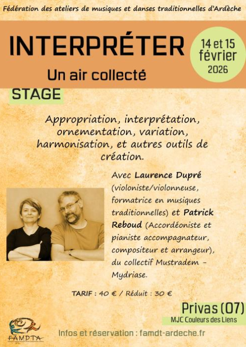 Dans le cadre de son projet Vivarais Vivant, la FAMDTA propose un stage autour de l'interprétation des airs traditionnels collectés, avec Laurence Dupré et Patrick Reboud de l'association Mydriase.