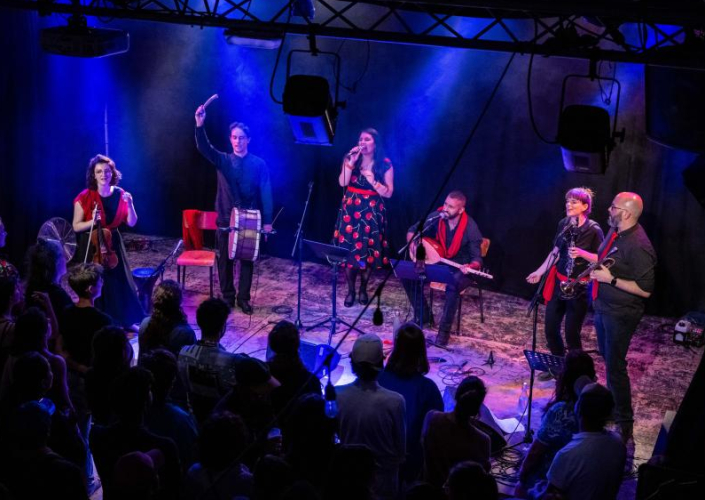 La voix envoûtante de Sabine Amar, les clarinettes eurasiennes de Manon Champel, la trompette balkanique de Thomas Mornay, le violon virtuose d’Alexia Parry-Jansen et le saz mésopotamien d’Okan Fidan se mêlent aux rythmes endiablés des percussions de Maxime Maillot.