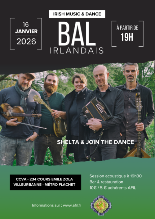 L'Association Franco-Irlandaise de Lyon vous donne rendez-vous le vendredi 16 janvier 2026 au CCVA à Villeurbanne à partir de 19h pour une grande soirée autour de la musique et de la danse irlandaise ☘️