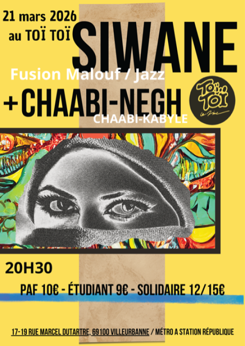 SIWANE partagera ses compositions originales inspirées des mélodies arabo-andalouses de style Malouf aux arrangements Jazz et Flamenco naviguent entre orient et occident, Lyes ILES, accompagné du groupe CHAABI-NEGH vous invite à un concert mêlant musiques et chants issus d’un répertoire poétique riche, à la fois ancestral et contemporain, enraciné dans la tradition orale et littéraire de la Kabylie.