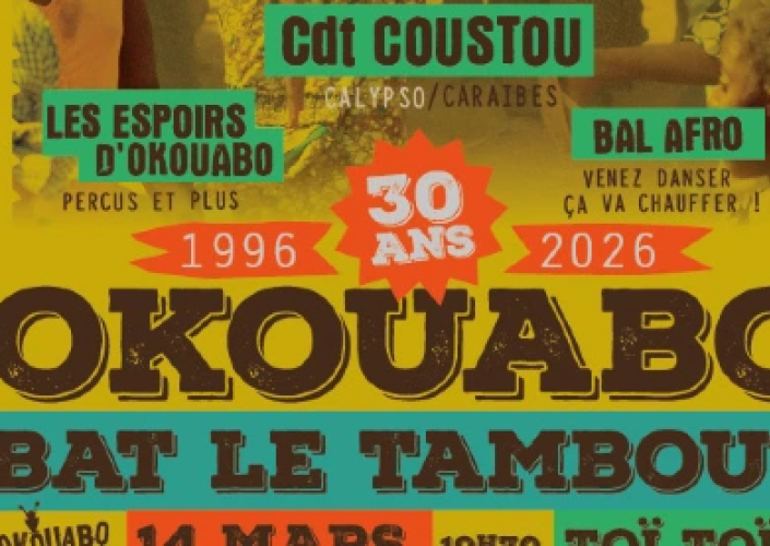 Billetterie en ligne : https://www.helloasso.com/associations/okouabo/evenements/okouabo-bat-le-tambour-2026-30-ans