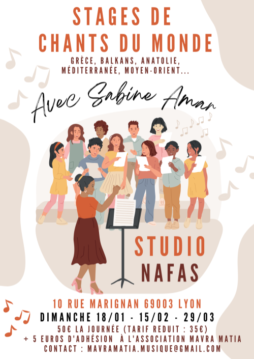 L'association Mavra Matia propose des stages de chants du monde animés par Sabine Amar, ouverts à toutes et tous, sans prérequis musicaux : un mome...