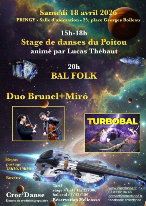 Programme: 15h – 18h stage de danses du Poitou animé par Lucas Thébaut 18h30 – 19h30 repas partagé 20h Bal Folk avec le Duo Brunel + Mir...